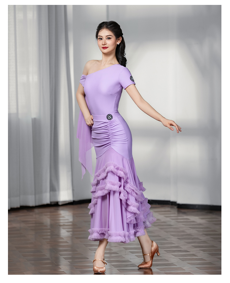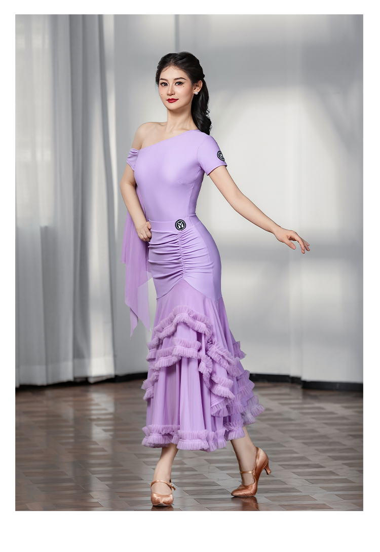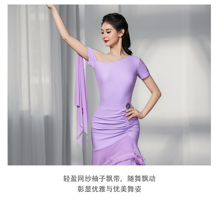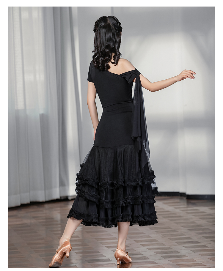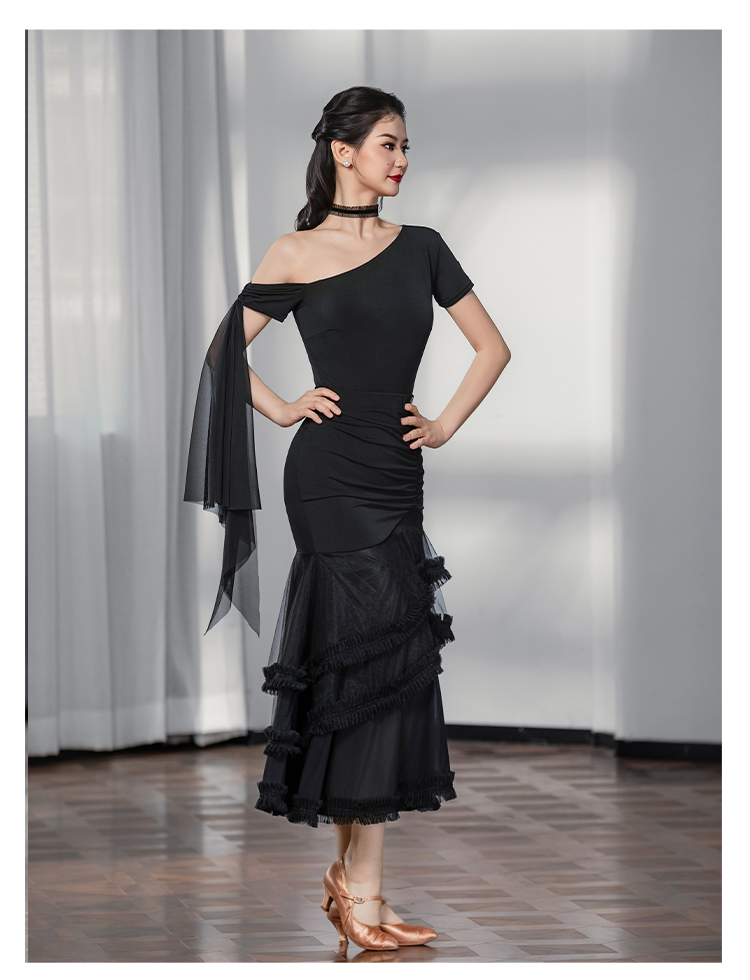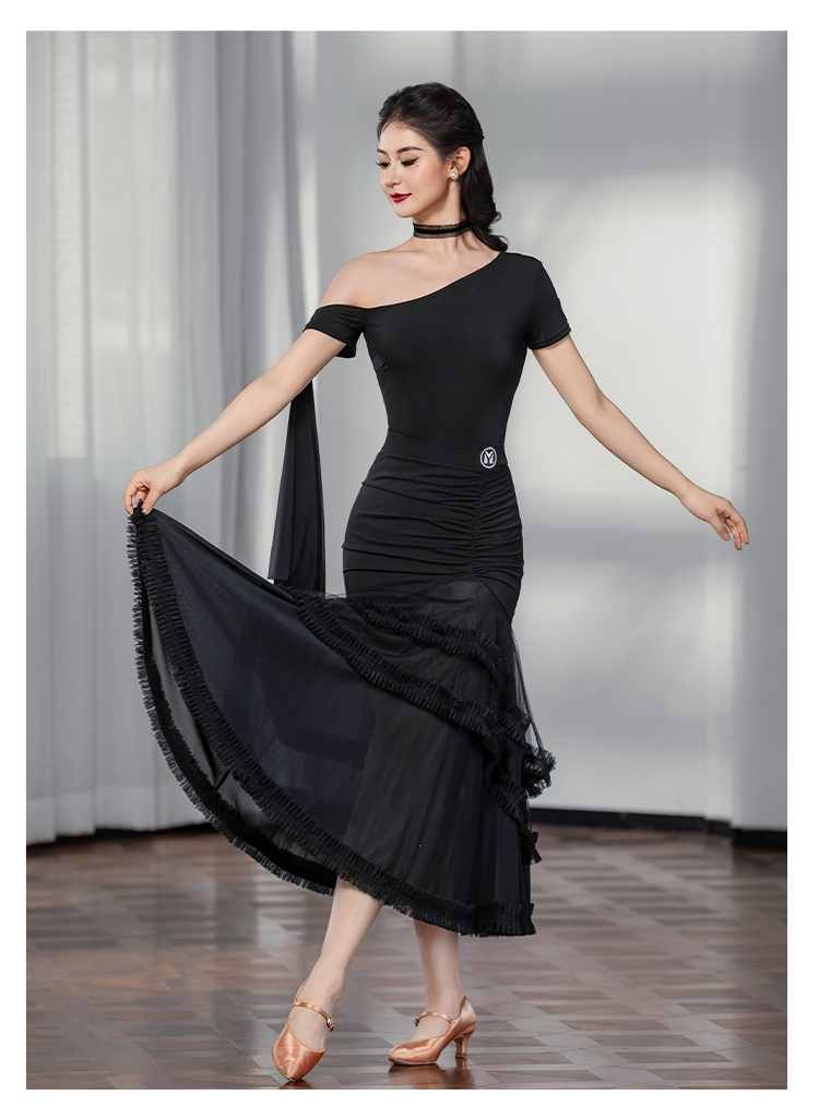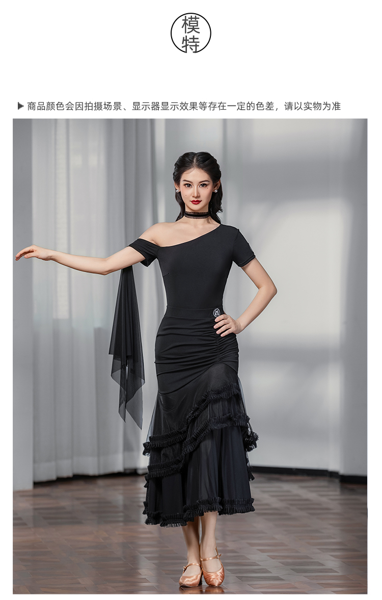 IAMYC摩登舞服女成新款斜肩上衣网纱下摆花边网纱裙B10137+B20098