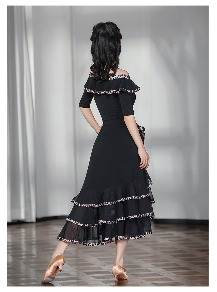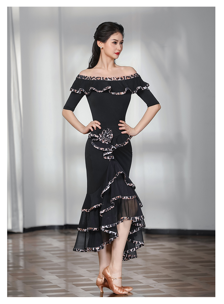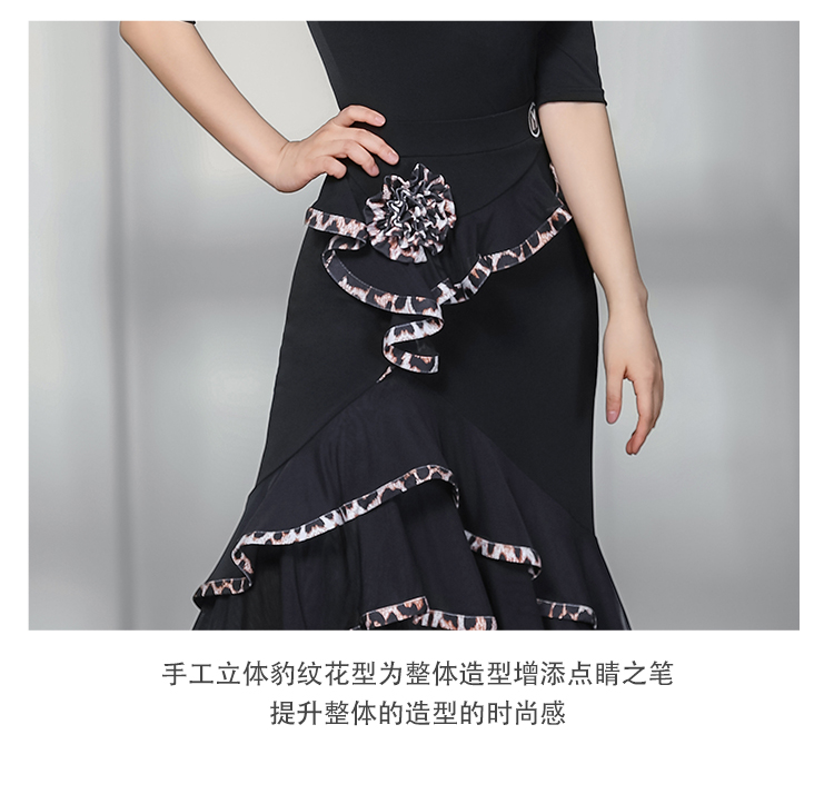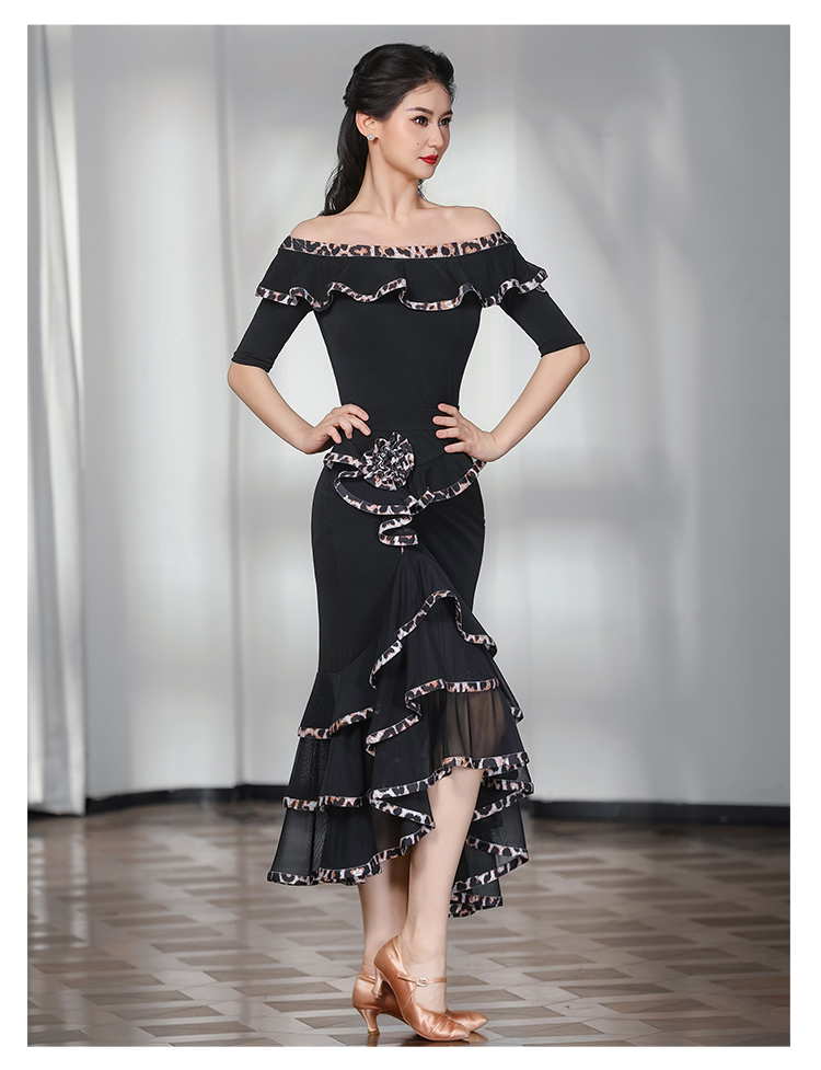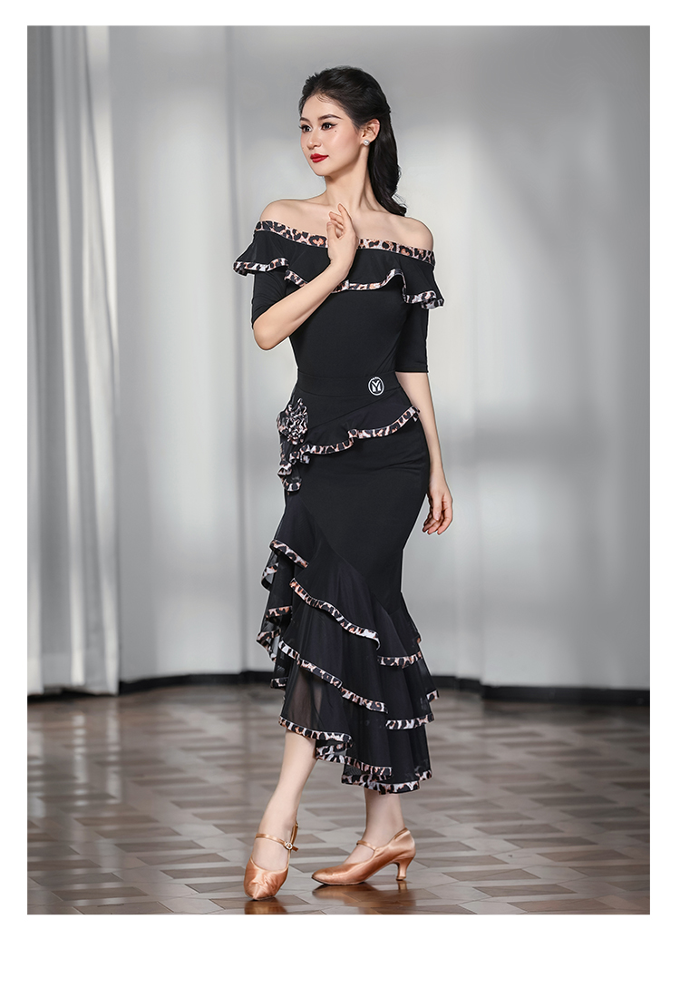 IAMYC摩登舞服女成练习服一字领豹纹花边套装表演服B10135+B20096