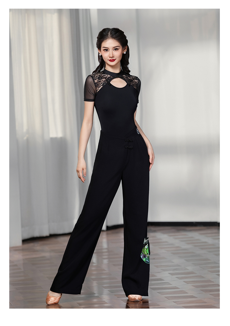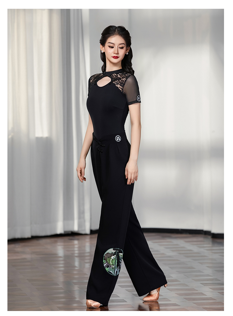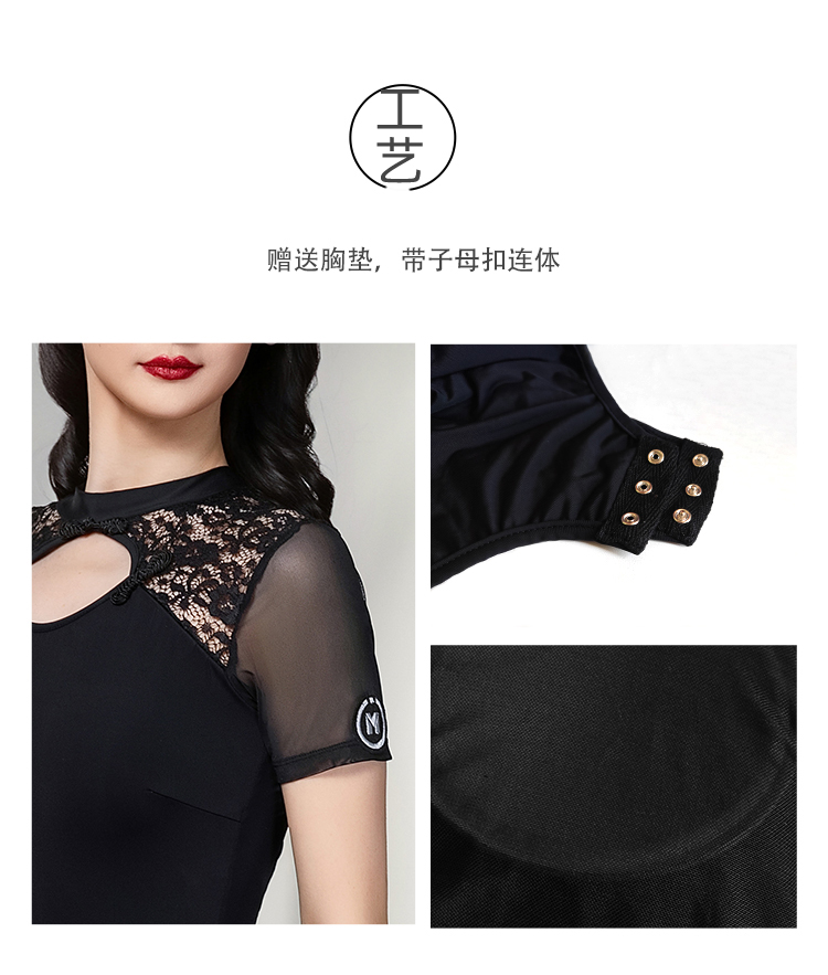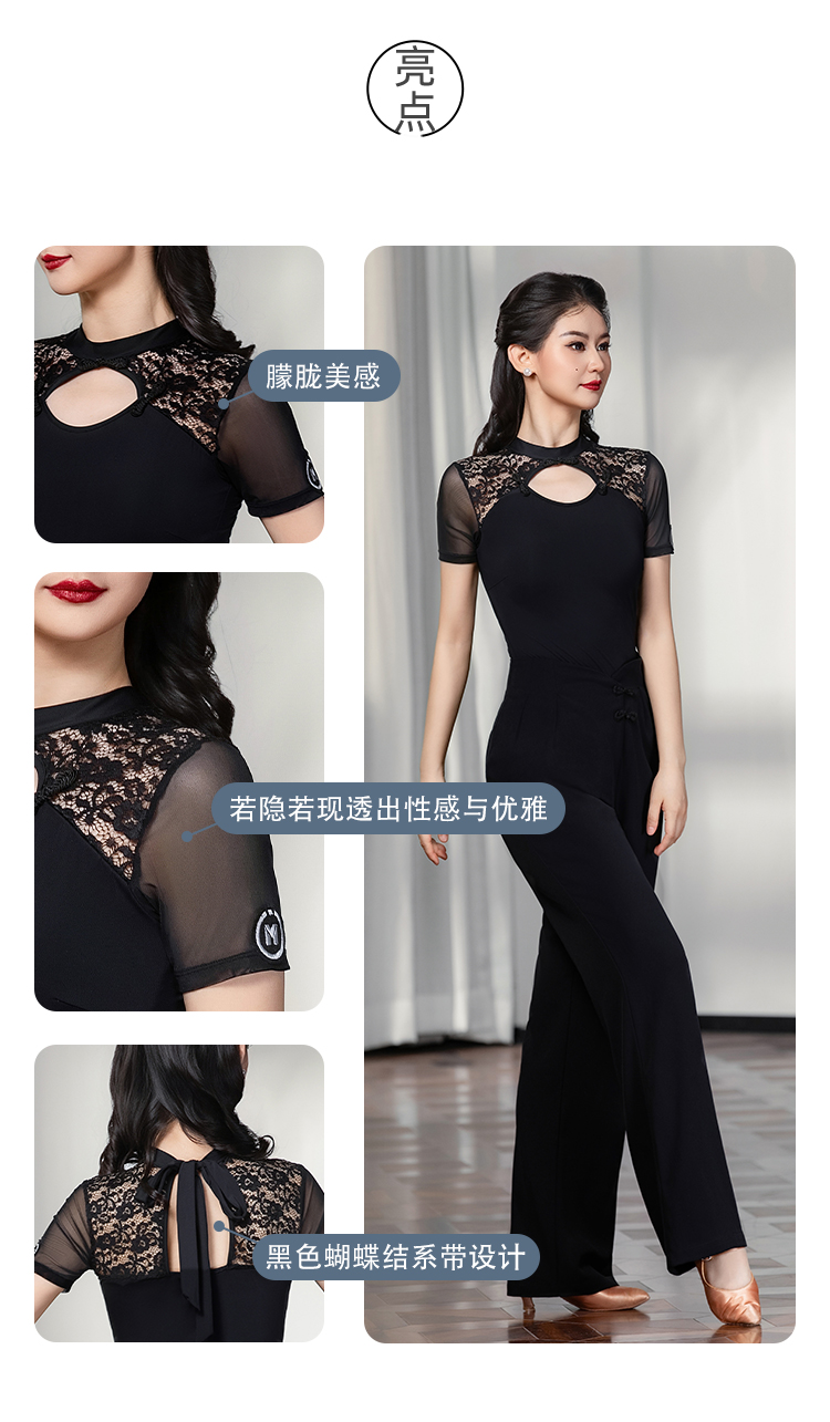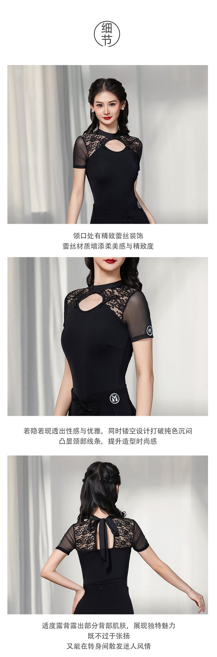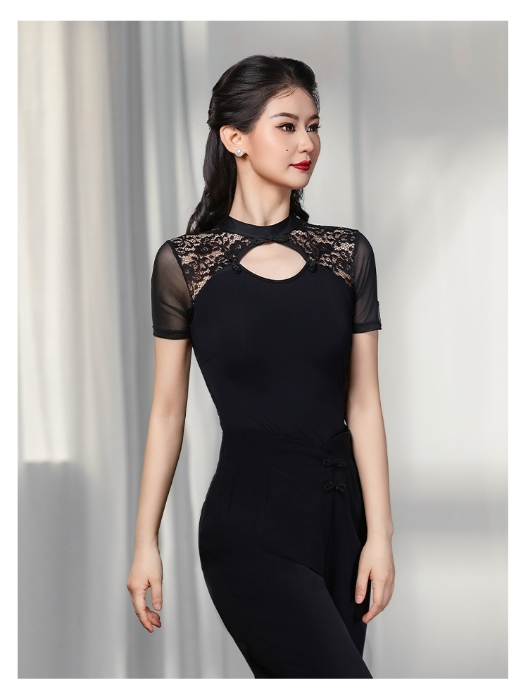 IAMYC成人摩登舞蹈服旗袍领镂空蕾丝拼接短袖形体练功服B10092