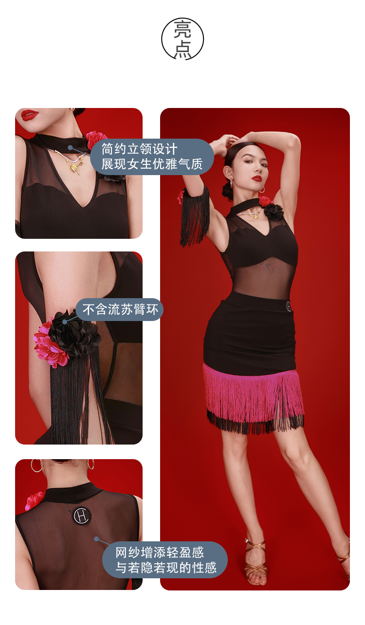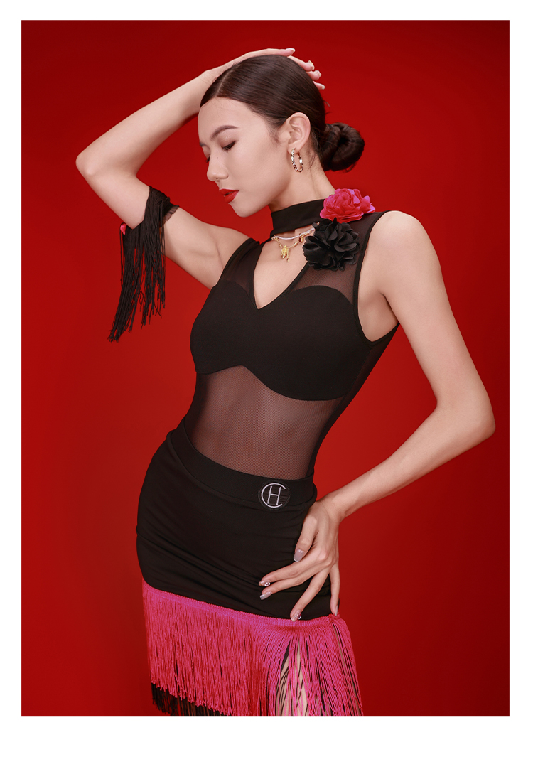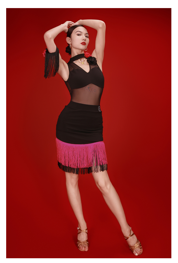 HCDance/皇朝舞蹈拉丁舞服无袖上衣撞色流苏半身裙DS1062+DX2053