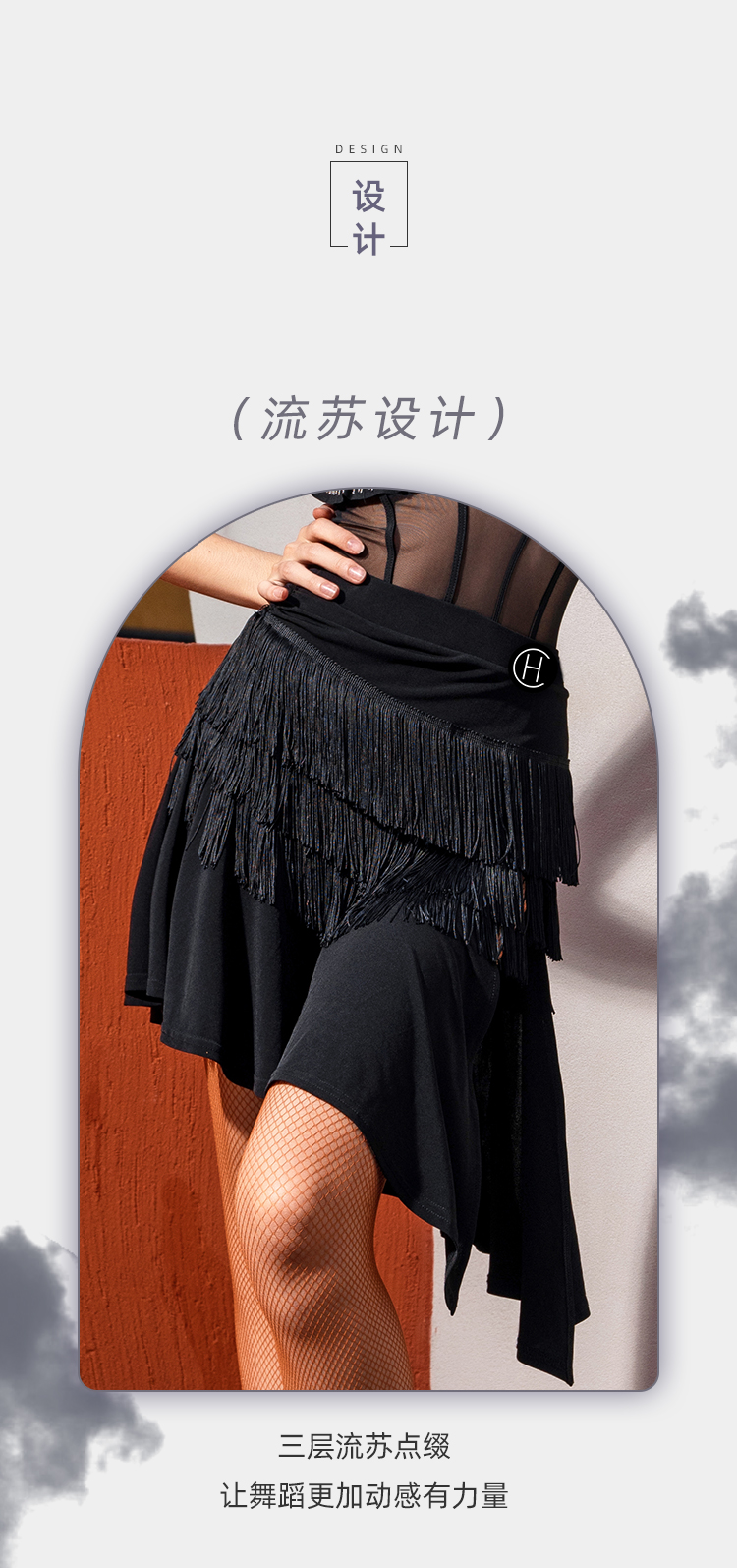 HC·DANCE 拉丁舞裙女士成人不规则黑色流苏练功服半身裙 DX066